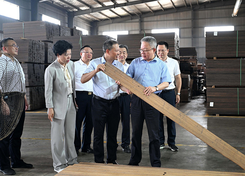 2025年6月16日,省政協副主席虢正貴來湖南桃花江竹材科技股份有限公司調研生態資源轉化與特色產業融合發展。公司董事長、省人大代表薛志成陪同并介紹情況。虢正貴充分肯定了桃花江竹材在竹資源利用及竹特色產業融合發展所取得的成果,他鼓勵企業繼續發揮龍頭優勢,充分利用好桃江資源稟賦和產業優勢,深化產學研融合,提升竹產業附加值,為民族地區生態資源高效轉化和特色產業融合發展探索更多經驗。